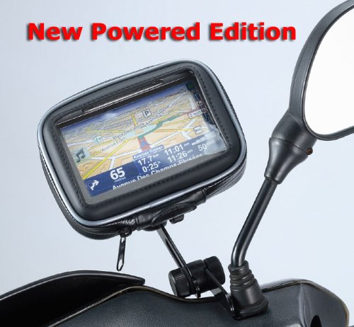The must have accessory for your Garmin, TomTom, Magellan, or other portable GPS. This powered motorcycle mount is entirely new and features newly designed bicycle and motorcycle mirror mount and the universal case for GPS. The transparent touch through lens allows you to view and control the touch screen of your GPS. A zipper on the case is easy to use and keeps the dust out. A cut out on the bottom of the case provides access for charging cable. Three pieces of foam included serve to fit the case with varying sizes of GPS brand or device size. The included battery compartment uses 8 x AA batteries which can double or triple the usage of the GPS.UNIVERSAL CASE:# Battery compartment (holds 8 x AA batteries)# 90 degree mini-USB power cable included# On/ Off switch# LED power indicator# New improved foams included for better fitting# Features transparent touch through lens, zipper enclosure, and a cut-out at bottom for charging cable access# Includes multiple pieces of foam for use as spacers with different sized GPS devices# Compatible with most 3.5, 4.3, 5 inch GPS devices# Garmin Nuvi 200, 500, 700, 800, 1200, 1300, 1400, 1600, 3700 series# Compatible with Magellan Maestro 3000/400 series, Crossover, and Roadmate 1000 Series GPS# Compatible with TomTom One, GO, XL, XXL series GPS