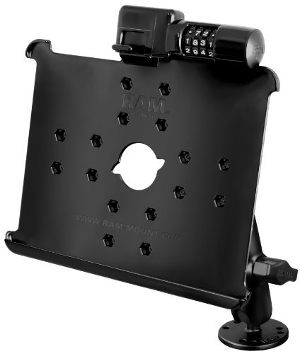 Simply choose your preferred mounting location and the possibilities become endless with the Apple iPad flat surface mount. The RAM flat surface mount consists of a double socket arm mount with two 2.5" diameter round bases with the universal AMPs hole pattern. Rubber ball and socket technology allows for almost infinite adjustment and perfect viewing angles. High quality materials insure your iPad is safe, secure, and within easy reach. RAMs patented design also dampens shock and vibration helping to extend the life of your mobile device. This mount is designed to hold the following devices: Apple iPad Wi-Fi 16GB, 32GB and 64GB Apple iPad Wi-Fi + 3G 16GB, 32GB and 64GB Locking Cradle Features: 1. Easy access to electronic ports 2. Dial combination lock 3. (4 qty) mounting points with pre-drilled holes, including the universal AMPS hole pattern. Material: High Strength Composite & Powder Coated Marine Grade Aluminum Ball Size: 1" Rubber Ball "B" Size