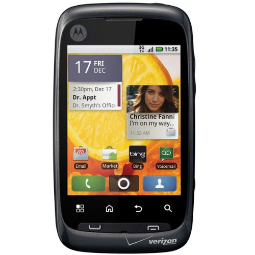 Motorola Citrus WX445 Android Smartphone for Verizon. This compact, affordable Android smartphone sports a unique trackpad for scrolling on the back, plus dedicated send/end keys on the front. Other key features include an eco-friendly shell, capacitive touch screen, full web browser, memory card slot, 3.5mm audio jack, EVDO 3G data, WiFi data, and 3-megapixel camera.. Includes:. Phone ; Battery ; Travel Charger ;Dimensions:. Weight: 3.88 oz (110 g); Size: 4.09 x 2.32 x 0.59 (104 x 59 x 15 mm) ;Specifications:. Modes: CDMA 850 / 1900; Form Bar: Internal Antenna; Display Type: LCD (Color TFT/TFD) Resolution: 240 x 320 pixels (QVGA) 3 diagonal; Platform Android version 2.1; Processor 528 MHz ; Memory 100 MB ;Features:. GPS / Location Type: A-GPS LBS, navigation; Multiple Languages Yes; Vibrate Yes; Bluetooth Supported Profiles: HSP, HFP, OPP, A2DP, AVRC, HID, PAN, MAP; USB Version: 2.0 High Speed micro-USB connector; Wi-Fi Version(s): 802.11 b,g; Multiple Numbers per Name Yes; Picture ID Yes; Ringer ID Yes; Voice Dialing Type: Speaker-independent (automatic); Custom Graphics Yes; Custom Ringtones Yes; Real-Music Ringers Supported Formats: AAC, AAC+, eAAC, eAAC+, MP3, OGG; Flight Mode Yes; High-Speed Data Technology: 1xEV-DO r0; WAP / Web Browser Browser Software: Android browser (WebKit-based); Side Keys volume, camera on right; Touch Screen Type: Capacitive multi-touch; Memory Card Slot Card Type: microSD (TransFlash) 2 GB card included / supports up to 32 GB; Email Client Protocols Supported: IMAP, POP, SMTP, Exchange OWA, GMail; Instant Messaging Networks Supported: Google Talk; MMS Yes; Text Messaging (SMS) View Style: Threaded; Headphone Jack (3.5mm) Yes; Music Player Supported Formats: MP3, AAC, AAC+, eAAC+, OGG, WMA, WAV, AMR-NB/WB supports DRM; Camera Resolution: 3+ megapixefixed-focus, geo-tagging; Streaming Vid